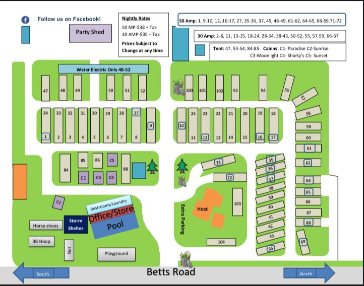 We are a 57 full hook up campground on the outskirts of Mitchell, South Dakota. We are convenietly located on Betts Road, Exit 325 I 90 2 blocks south. We offer 11 acres of shade along with many amenities.